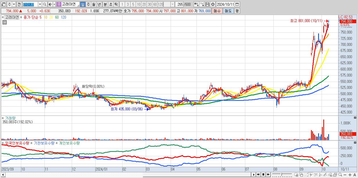 - 고려아연 (794,000원 ▲ 0.63% , 시총: 164,384억, 거래량: 350,083, 거래대금:2,771억)