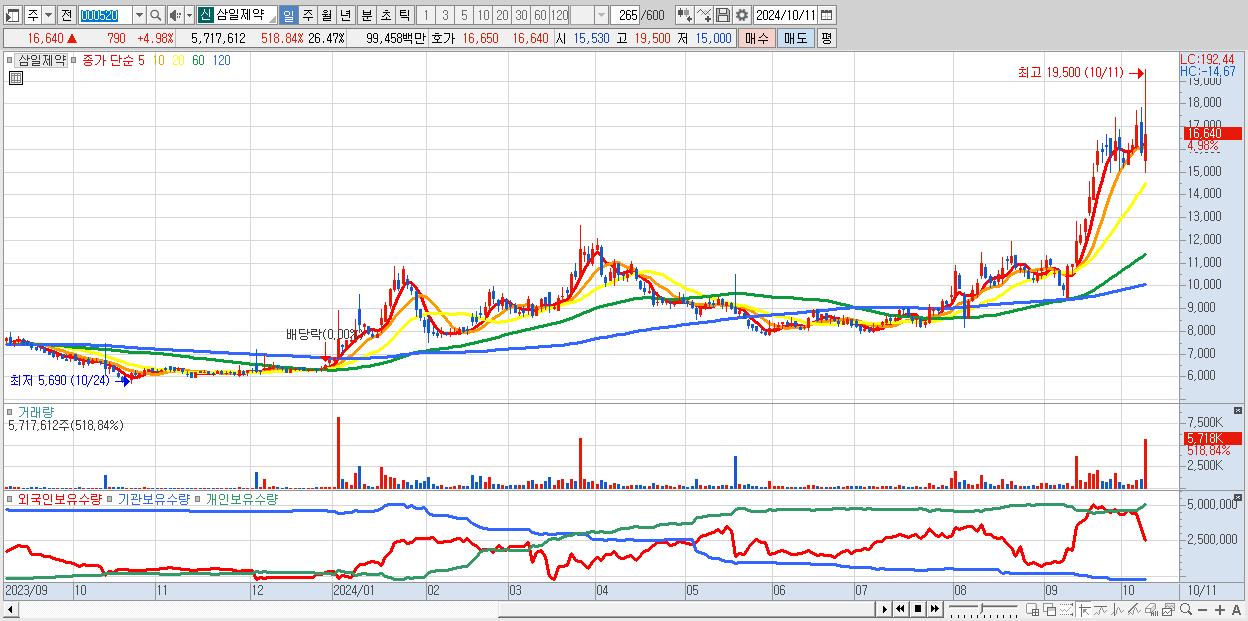 - 삼일제약 (16,640원 ▲ 4.98% , 시총: 3,594억, 거래량: 5,717,612, 거래대금:995억)