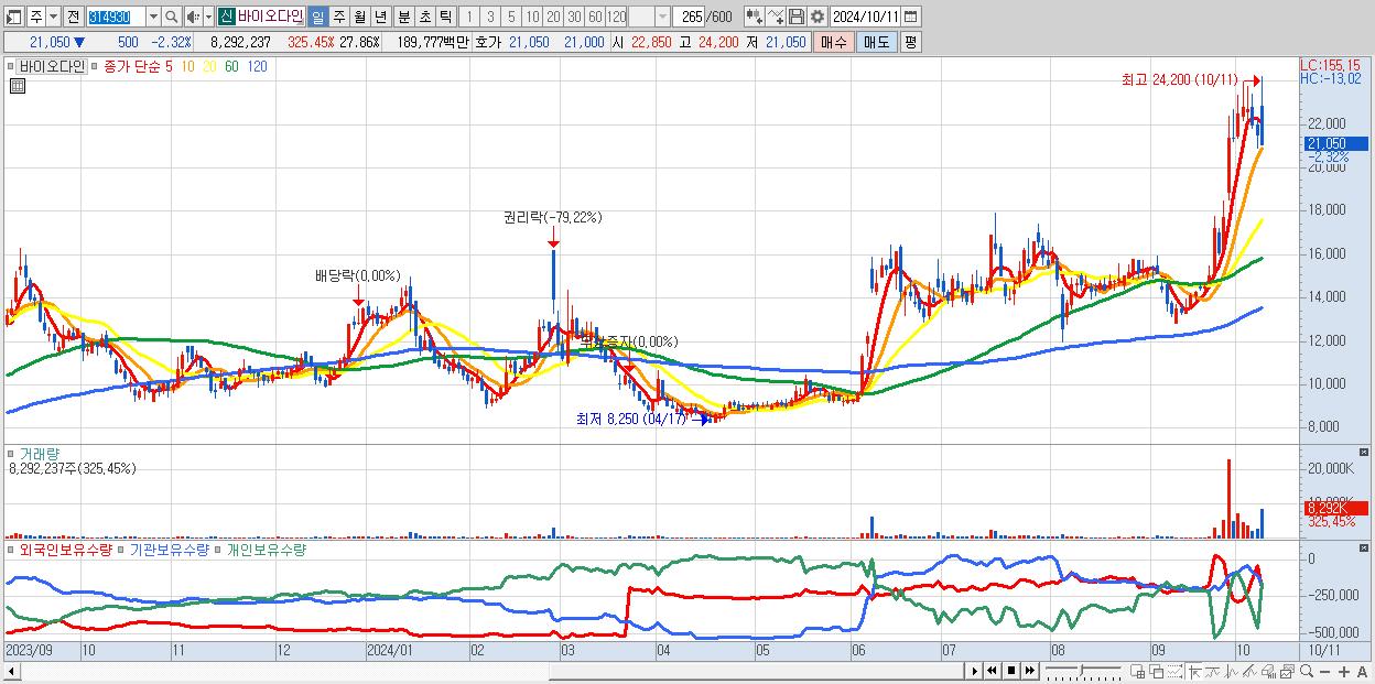 - 바이오다인 (21,050원 ▼ -2.32% , 시총: 6,265억, 거래량: 8,292,237, 거래대금:1,898억)