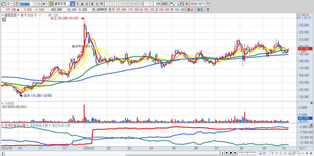 - 셀트리온 (197,300원 ▲ 1.54% , 시총: 428,183억, 거래량: 483,589, 거래대금:951억)
