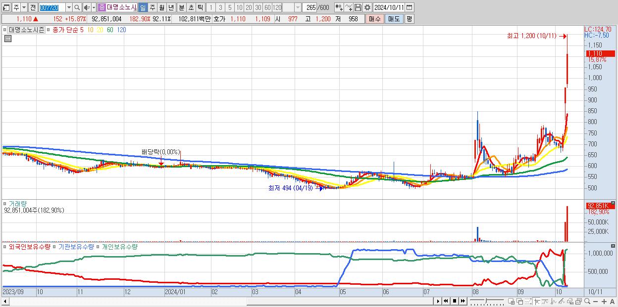 - 대명소노시즌 (1,110원 ▲ 15.87% , 시총: 1,119억, 거래량: 92,851,004, 거래대금:1,028억)
