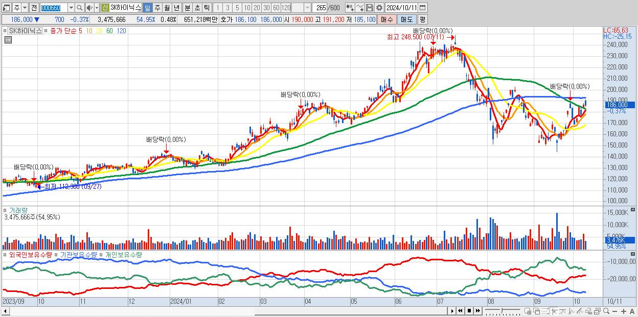 - SK하이닉스 (186,000원 ▼ -0.37% , 시총: 1,354,084억, 거래량: 3,475,666, 거래대금:6,512억)