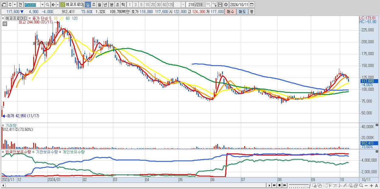 - 에코프로머티 (117,600원 ▼ -4% , 시총: 81,227억, 거래량: 912,411, 거래대금:1,098억)