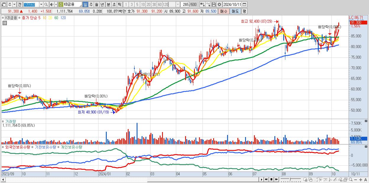 - KB금융 (91,300원 ▲ 1.56% , 시총: 359,291억, 거래량: 1,111,764, 거래대금:1,009억)