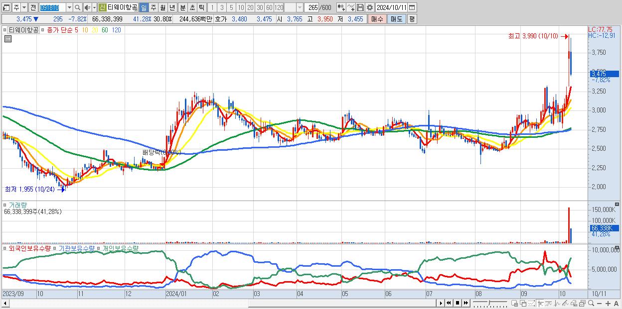 - 티웨이항공 (3,475원 ▼ -7.82% , 시총: 7,484억, 거래량: 66,338,399, 거래대금:2,446억)