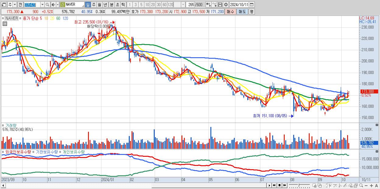 - NAVER (173,300원 ▲ 0.52% , 시총: 278,640억, 거래량: 576,782, 거래대금:995억)
