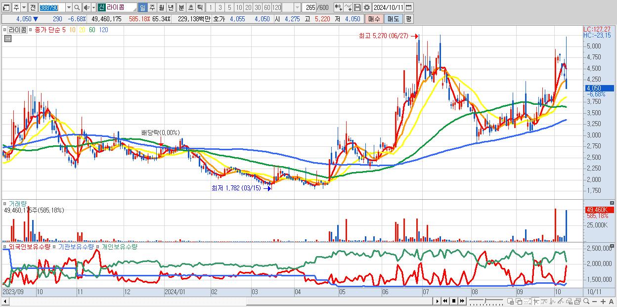 - 라이콤 (4,050원 ▼ -6.68% , 시총: 1,212억, 거래량: 49,460,175, 거래대금:2,291억)