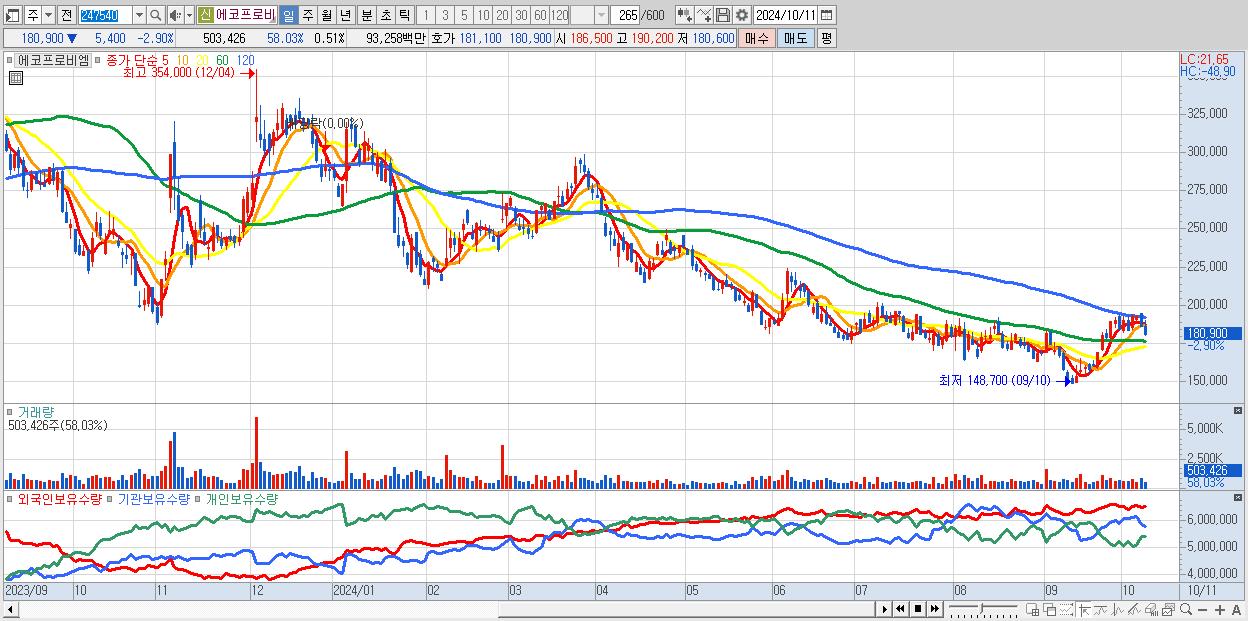 - 에코프로비엠 (180,900원 ▼ -2.9% , 시총: 176,923억, 거래량: 503,426, 거래대금:933억)