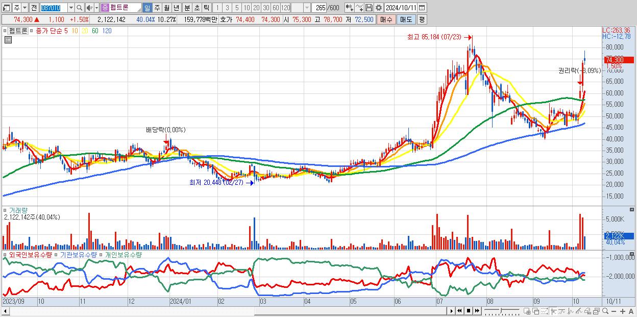 - 펩트론 (74,300원 ▲ 1.5% , 시총: 15,348억, 거래량: 2,122,142, 거래대금:1,598억)