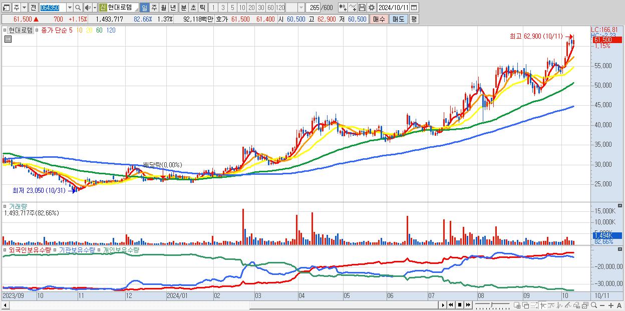 - 현대로템 (61,500원 ▲ 1.15% , 시총: 67,123억, 거래량: 1,493,717, 거래대금:921억)