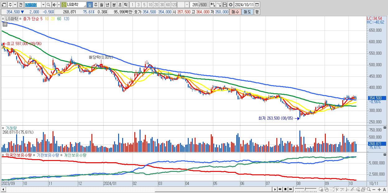 - LG화학 (354,500원 ▼ -0.56% , 시총: 250,250억, 거래량: 268,871, 거래대금:960억)