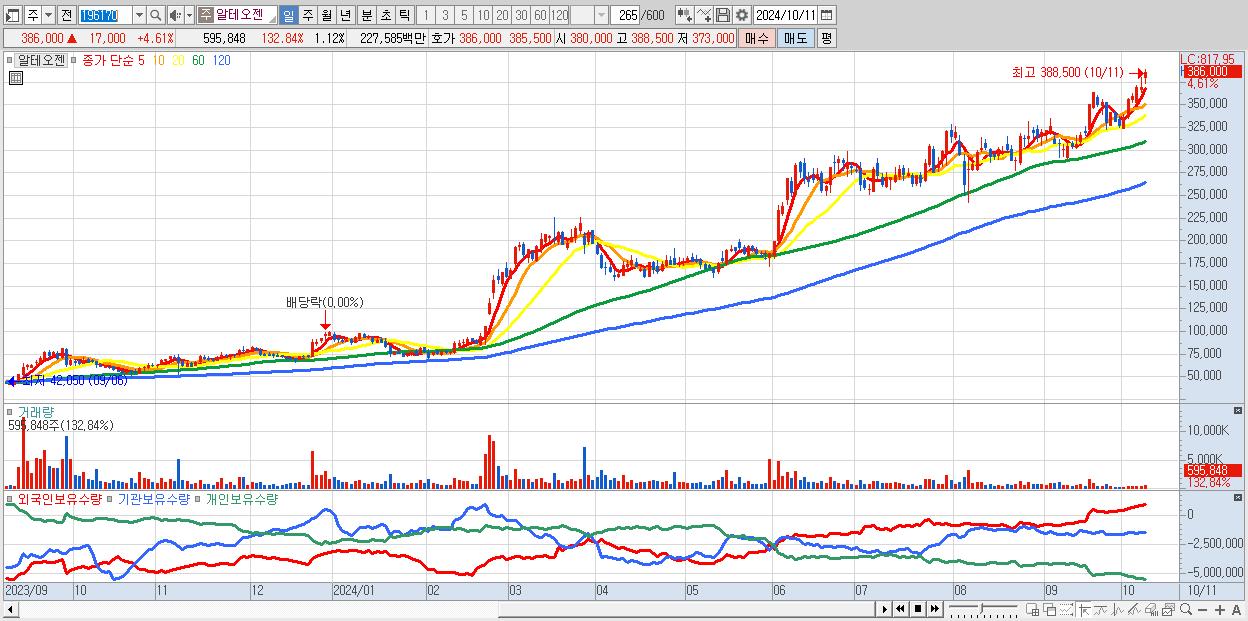- 알테오젠 (386,000원 ▲ 4.61% , 시총: 205,153억, 거래량: 595,848, 거래대금:2,276억)