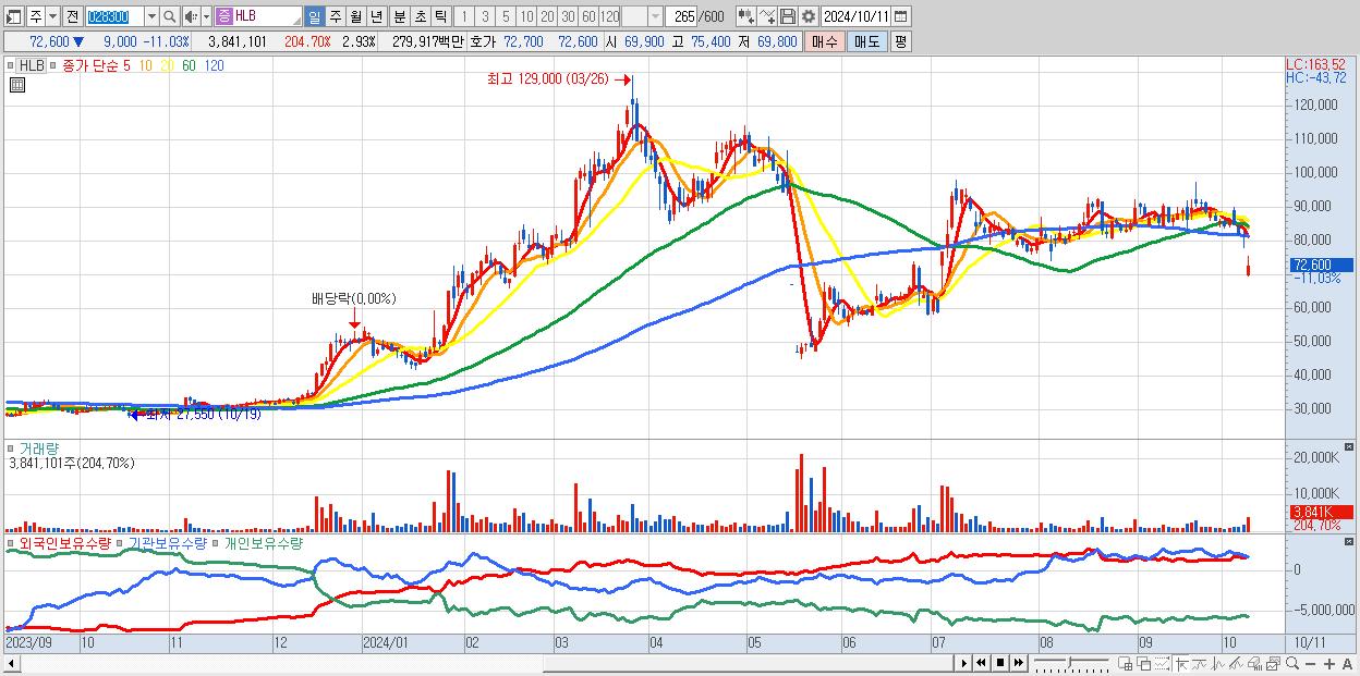- HLB (72,600원 ▼ -11.03% , 시총: 95,198억, 거래량: 3,841,101, 거래대금:2,799억)