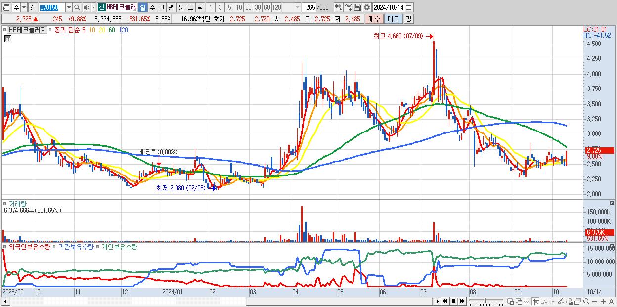 - HB테크놀러지 (2,725원 ▲ 9.88% , 시총: 2,527억, 거래량: 6,374,666, 거래대금:170억)