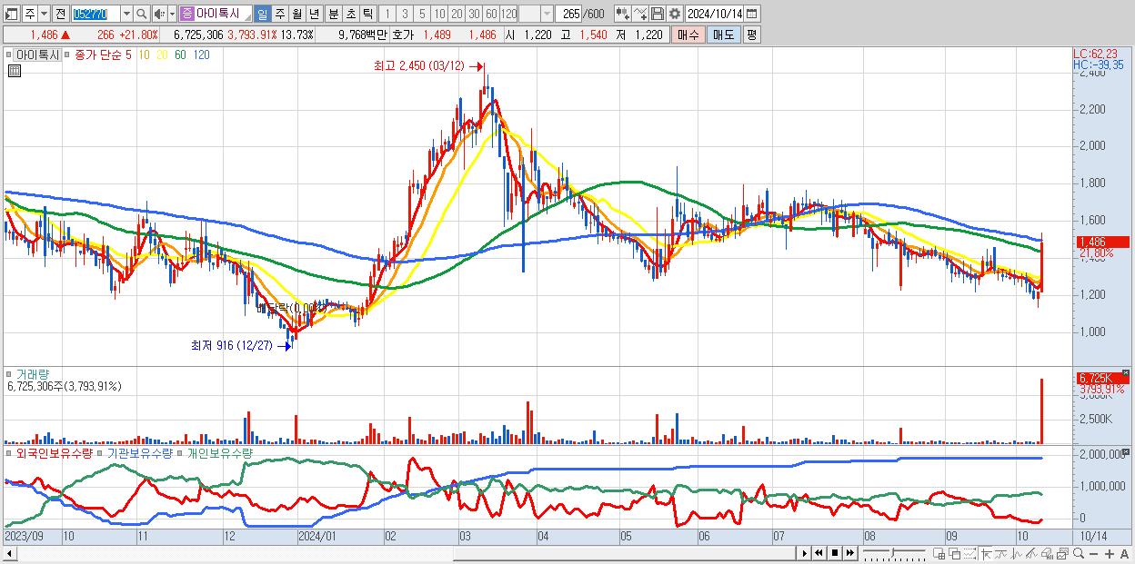 - 아이톡시 (1,486원 ▲ 21.8% , 시총: 728억, 거래량: 6,725,306, 거래대금:98억)