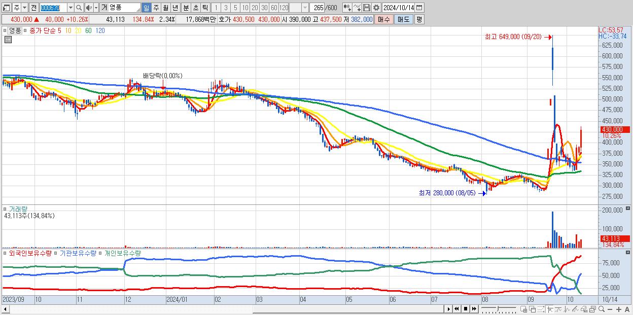 - 영풍 (430,000원 ▲ 10.26% , 시총: 7,921억, 거래량: 43,113, 거래대금:179억)