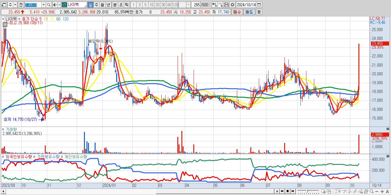 - 나이벡 (23,450원 ▲ 29.99% , 시총: 2,413억, 거래량: 2,985,642, 거래대금:660억)