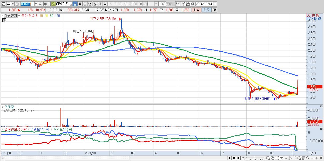 - 아남전자 (1,380원 ▲ 10.93% , 시총: 1,064억, 거래량: 12,515,041, 거래대금:179억)