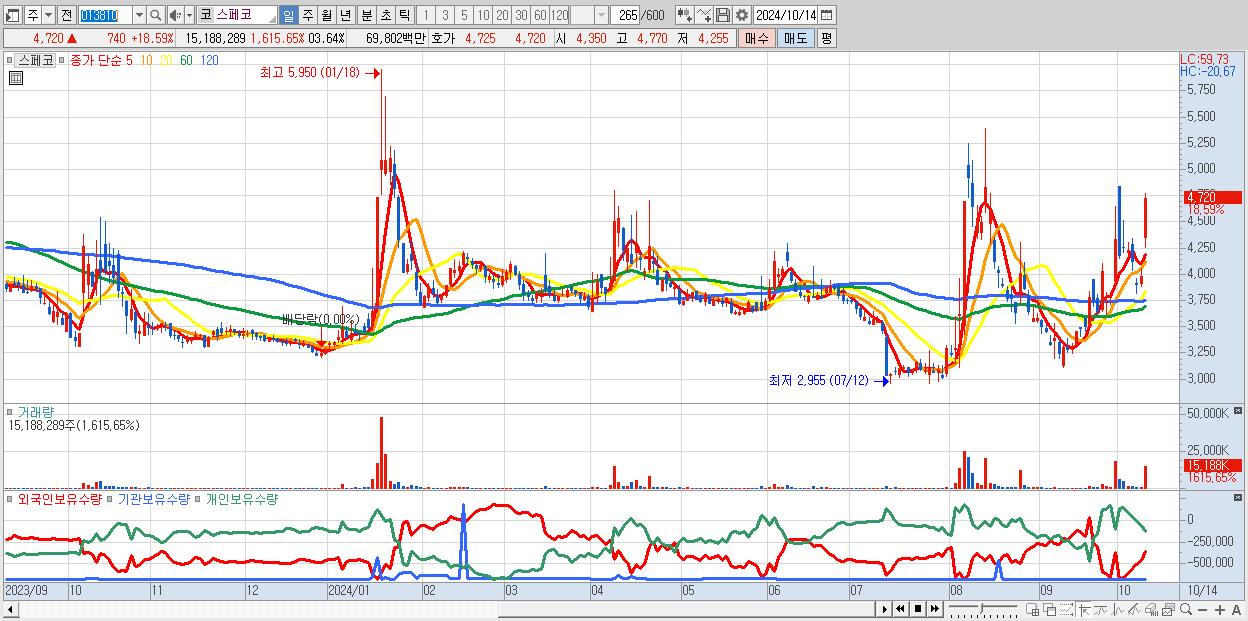 - 스페코 (4,720원 ▲ 18.59% , 시총: 692억, 거래량: 15,188,289, 거래대금:698억)
