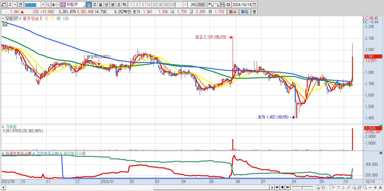 - 무림SP (1,941원 ▲ 13.58% , 시총: 430억, 거래량: 3,261,879, 거래대금:63억)