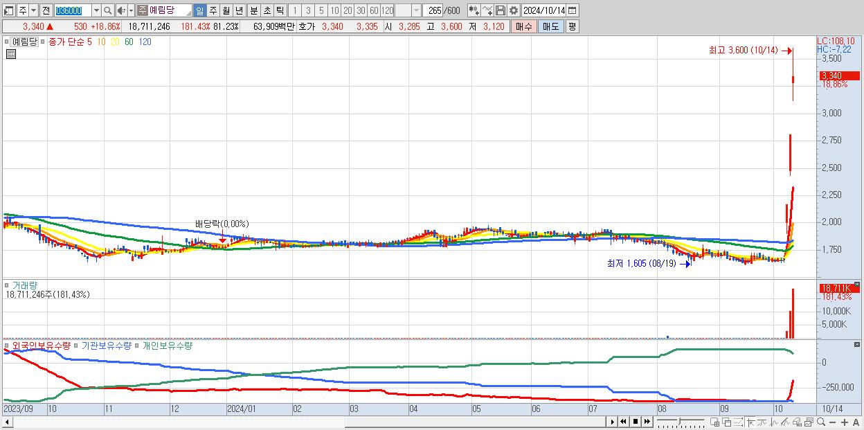 - 예림당 (3,340원 ▲ 18.86% , 시총: 769억, 거래량: 18,711,246, 거래대금:639억)