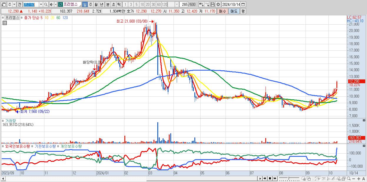 - 프리엠스 (12,290원 ▲ 10.22% , 시총: 737억, 거래량: 163,357, 거래대금:19억)
