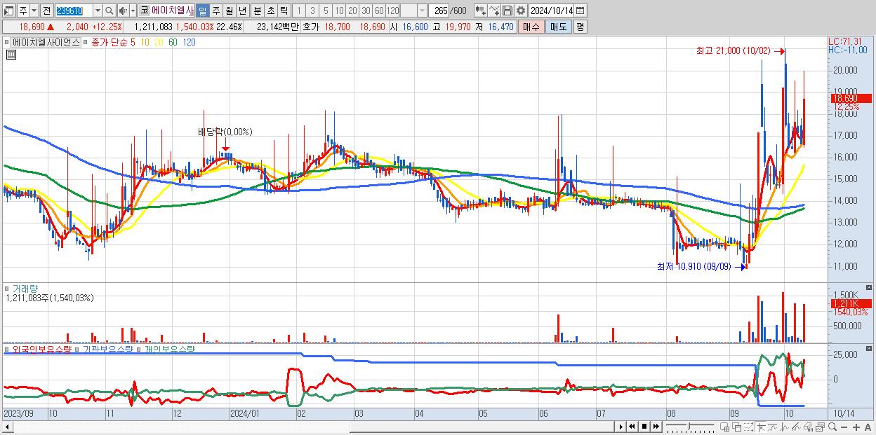 - 에이치엘사이언스 (18,690원 ▲ 12.25% , 시총: 1,008억, 거래량: 1,211,083, 거래대금:231억)