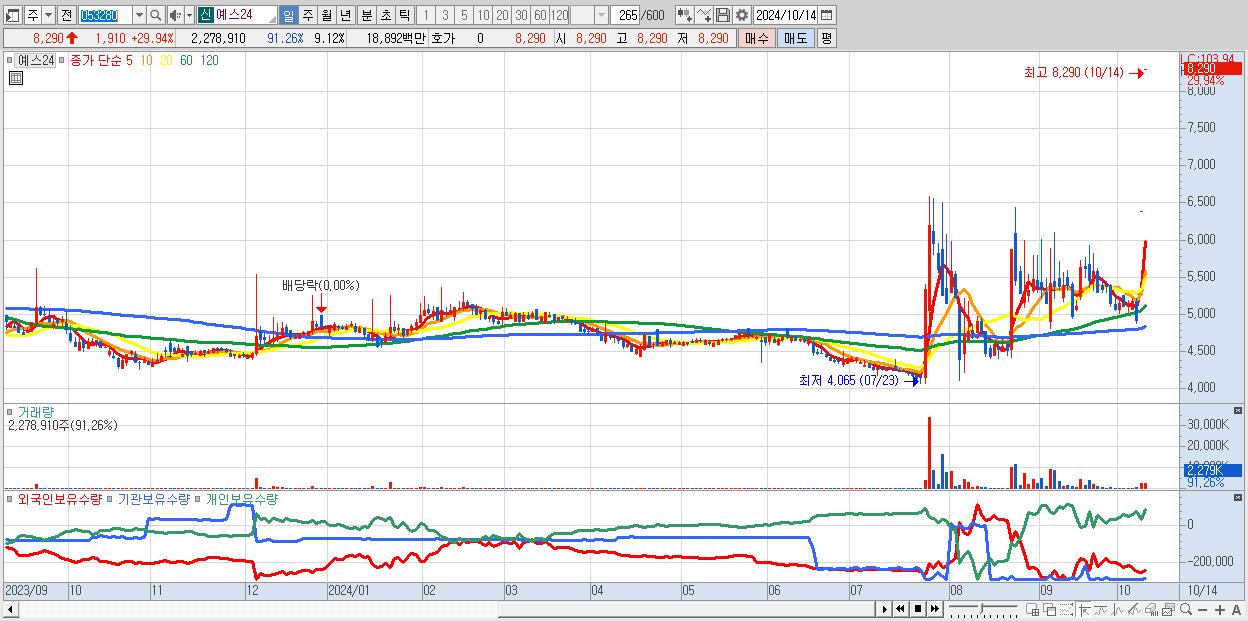 - 예스24 (8,290원 ▲ 29.94% , 시총: 2,073억, 거래량: 2,278,910, 거래대금:189억)