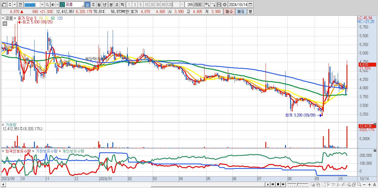 - 코콤 (4,670원 ▲ 21.93% , 시총: 819억, 거래량: 12,412,951, 거래대금:570억)