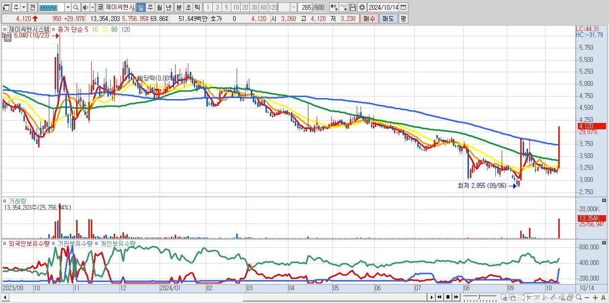 - 제이씨현시스템 (4,120원 ▲ 29.97% , 시총: 788억, 거래량: 13,354,203, 거래대금:516억)