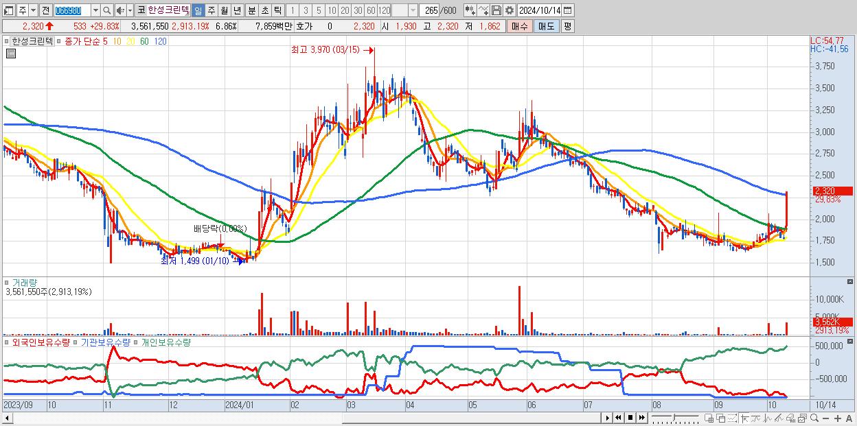 - 한성크린텍 (2,320원 ▲ 29.83% , 시총: 1,205억, 거래량: 3,561,550, 거래대금:79억)