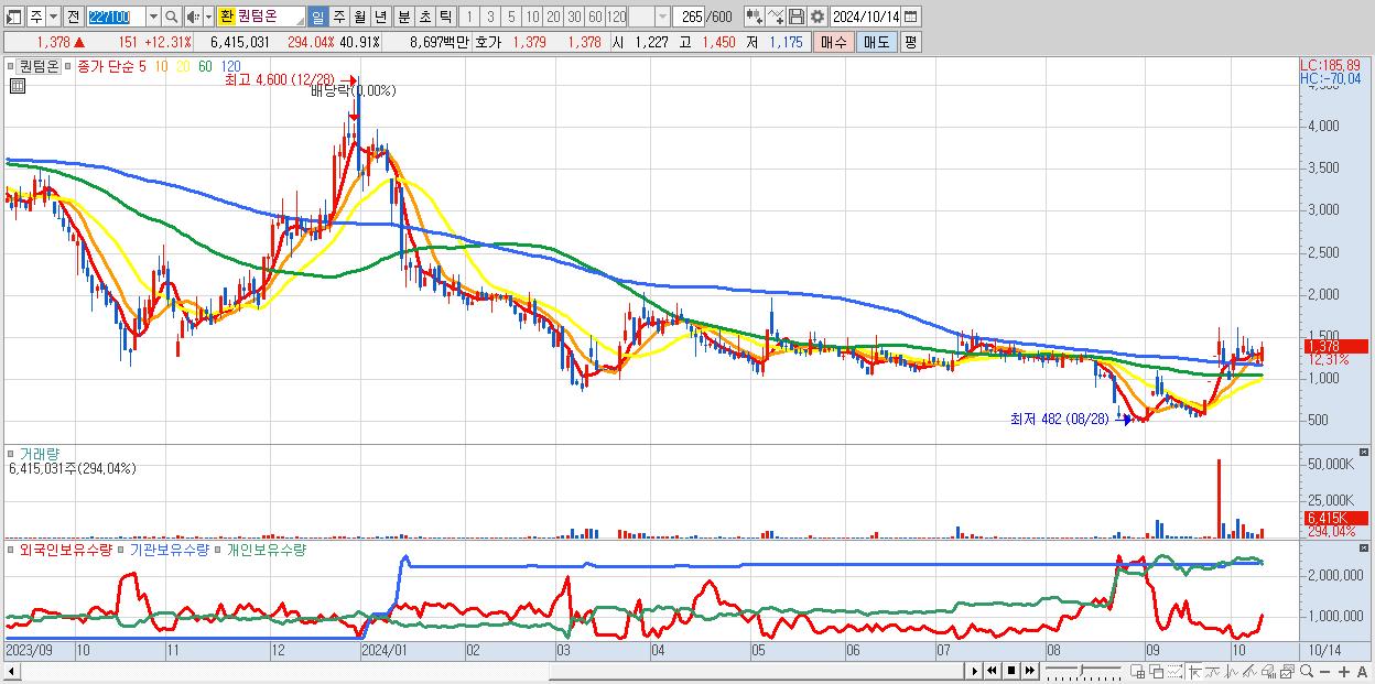 - 퀀텀온 (1,378원 ▲ 12.31% , 시총: 216억, 거래량: 6,415,031, 거래대금:87억)