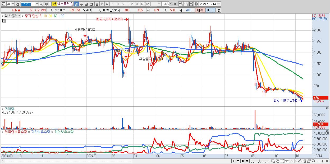 - 엑스플러스 (486원 ▲ 12.24% , 시총: 368억, 거래량: 4,097,807, 거래대금:19억)