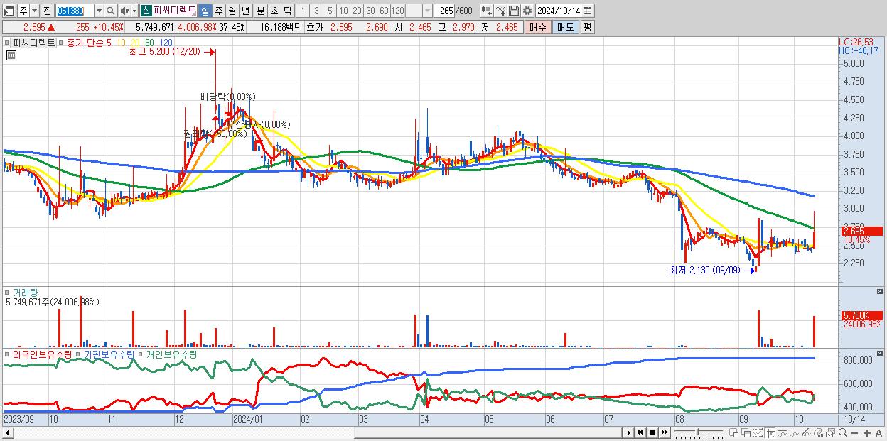 - 피씨디렉트 (2,695원 ▲ 10.45% , 시총: 413억, 거래량: 5,749,671, 거래대금:162억)