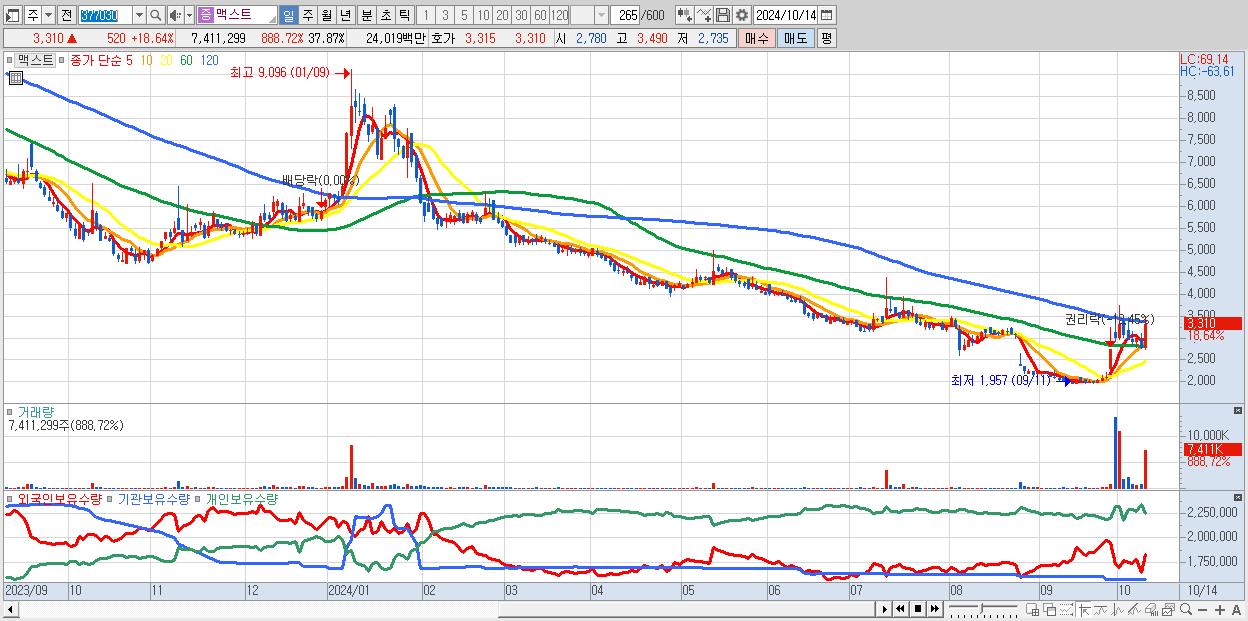 - 맥스트 (3,310원 ▲ 18.64% , 시총: 648억, 거래량: 7,411,299, 거래대금:240억)