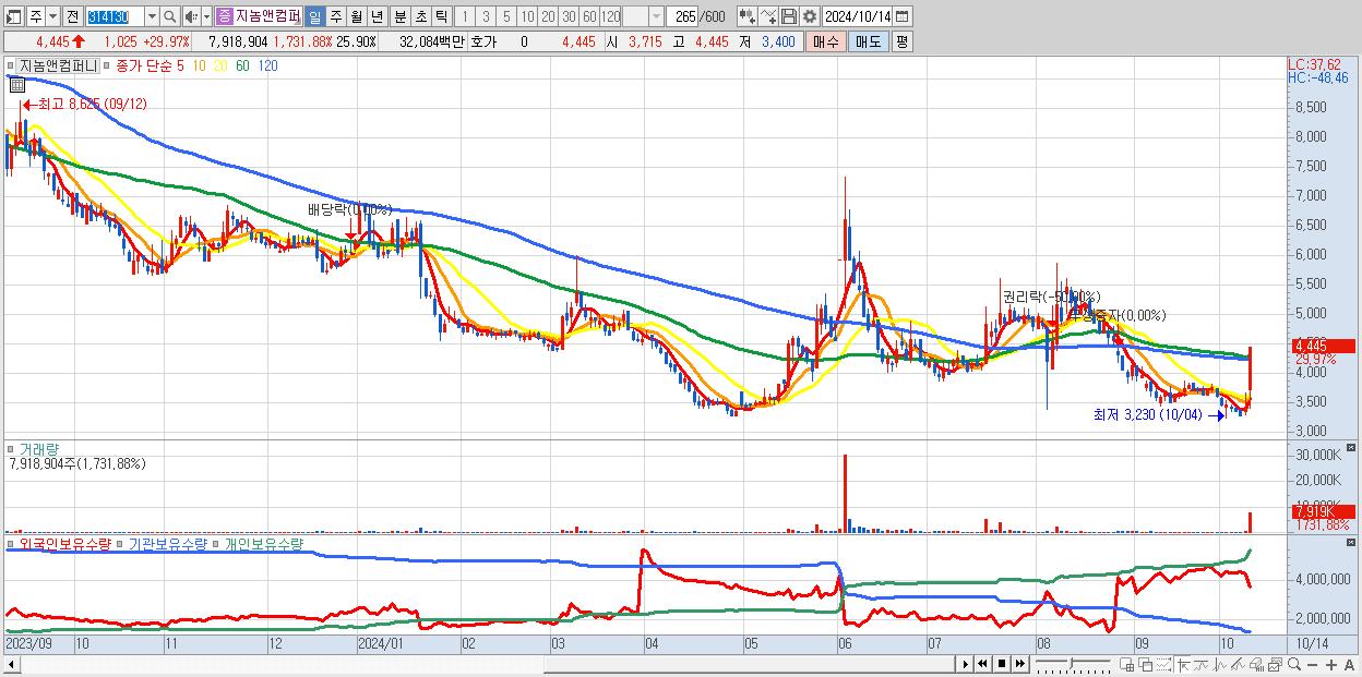 - 지놈앤컴퍼니 (4,445원 ▲ 29.97% , 시총: 1,359억, 거래량: 7,918,904, 거래대금:321억)