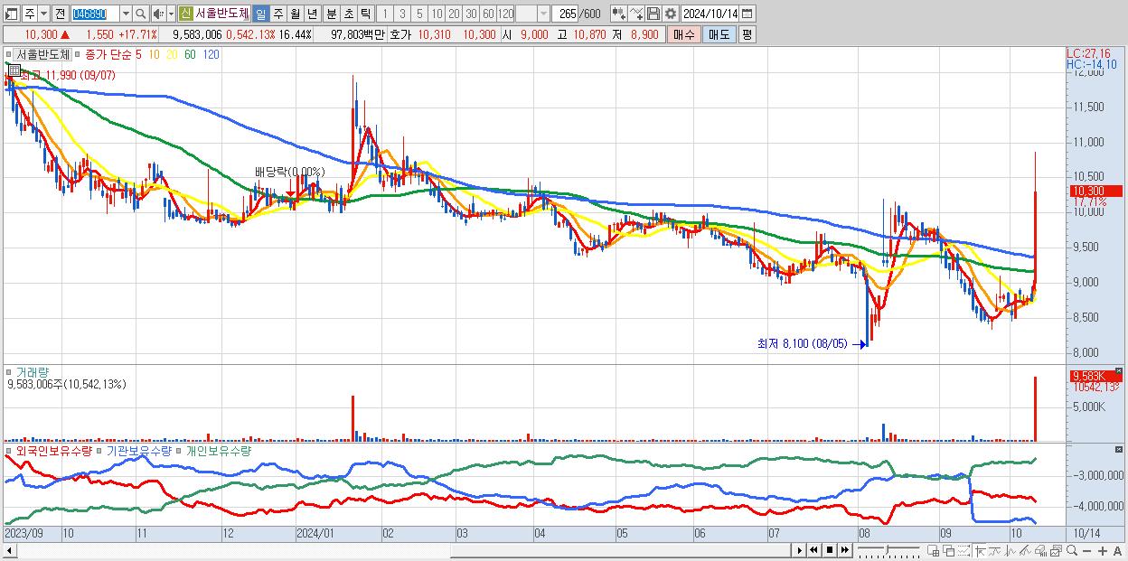 - 서울반도체 (10,300원 ▲ 17.71% , 시총: 6,005억, 거래량: 9,583,006, 거래대금:978억)