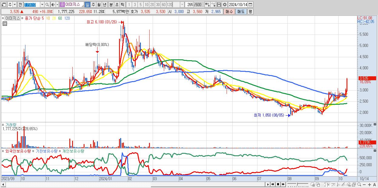 - 이미지스 (3,535원 ▲ 16.09% , 시총: 557억, 거래량: 1,777,225, 거래대금:60억)