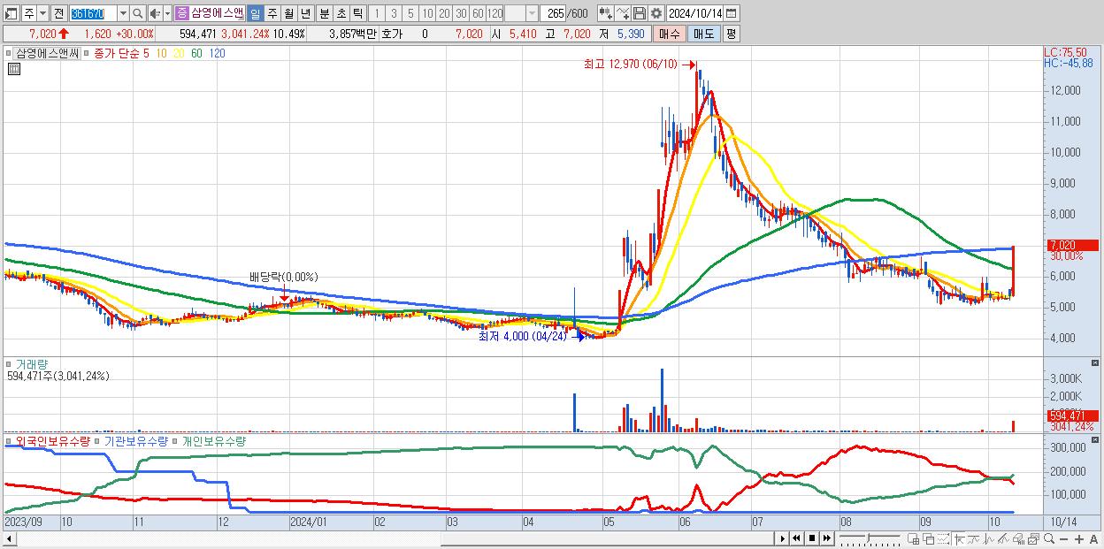 - 삼영에스앤씨 (7,020원 ▲ 30% , 시총: 398억, 거래량: 594,471, 거래대금:39억)