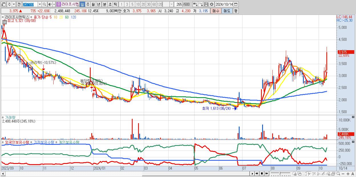 - 라이프시맨틱스 (3,975원 ▲ 22.69% , 시총: 795억, 거래량: 2,488,448, 거래대금:90억)