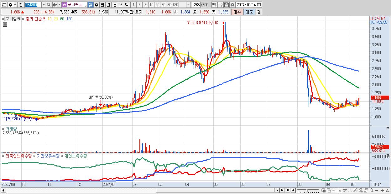 - 포니링크 (1,606원 ▲ 14.88% , 시총: 2,053억, 거래량: 7,582,465, 거래대금:119억)