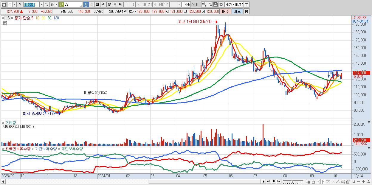 - LS (127,900원 ▲ 6.05% , 시총: 41,184억, 외국인 순매수 거래금:76억)