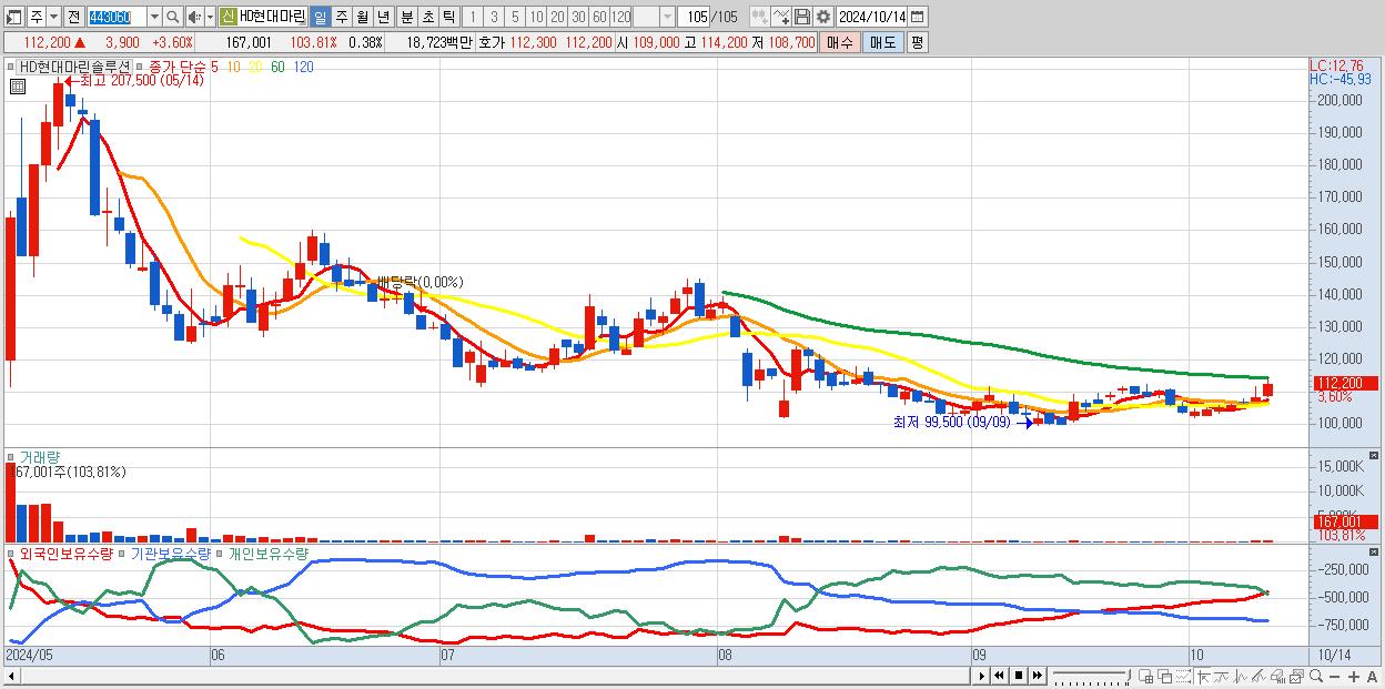 - HD현대마린솔루션 (112,200원 ▲ 3.6% , 시총: 49,873억, 외국인 순매수 거래금:61억)