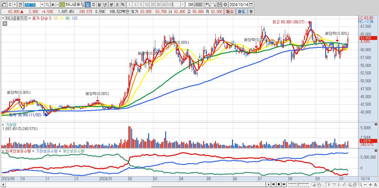 - 하나금융지주 (63,800원 ▲ 4.59% , 시총: 183,260억, 외국인 순매수 거래금:215억)