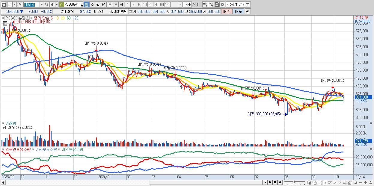 - POSCO홀딩스 (364,500원 ▼ -0.68% , 시총: 301,166억, 외국인 순매수 거래금:59억)