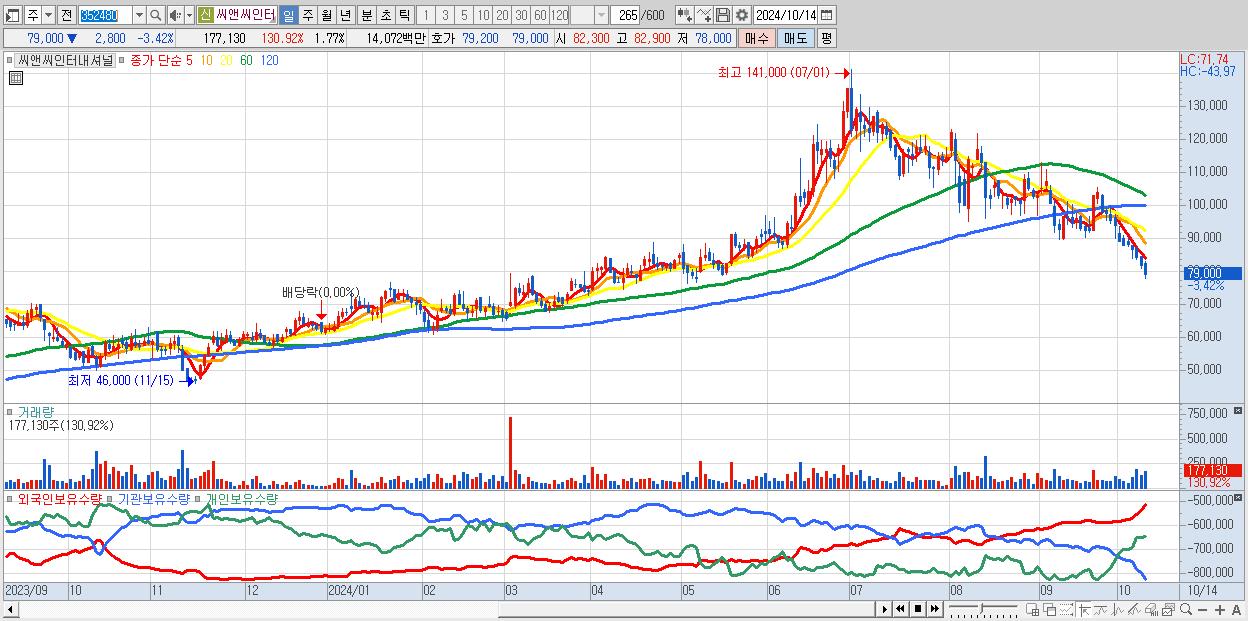 - 씨앤씨인터내셔널 (79,000원 ▼ -3.42% , 시총: 7,911억, 외국인 순매수 거래금:56억)