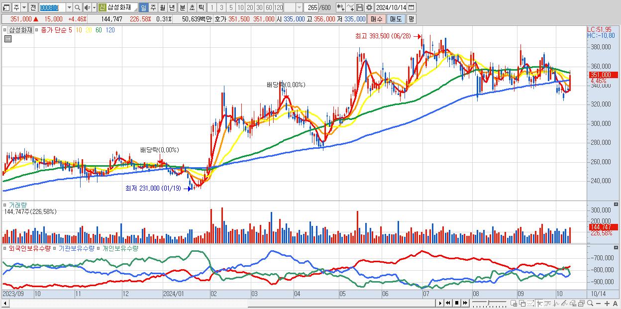- 삼성화재 (351,000원 ▲ 4.46% , 시총: 166,286억, 외국인 순매수 거래금:78억)