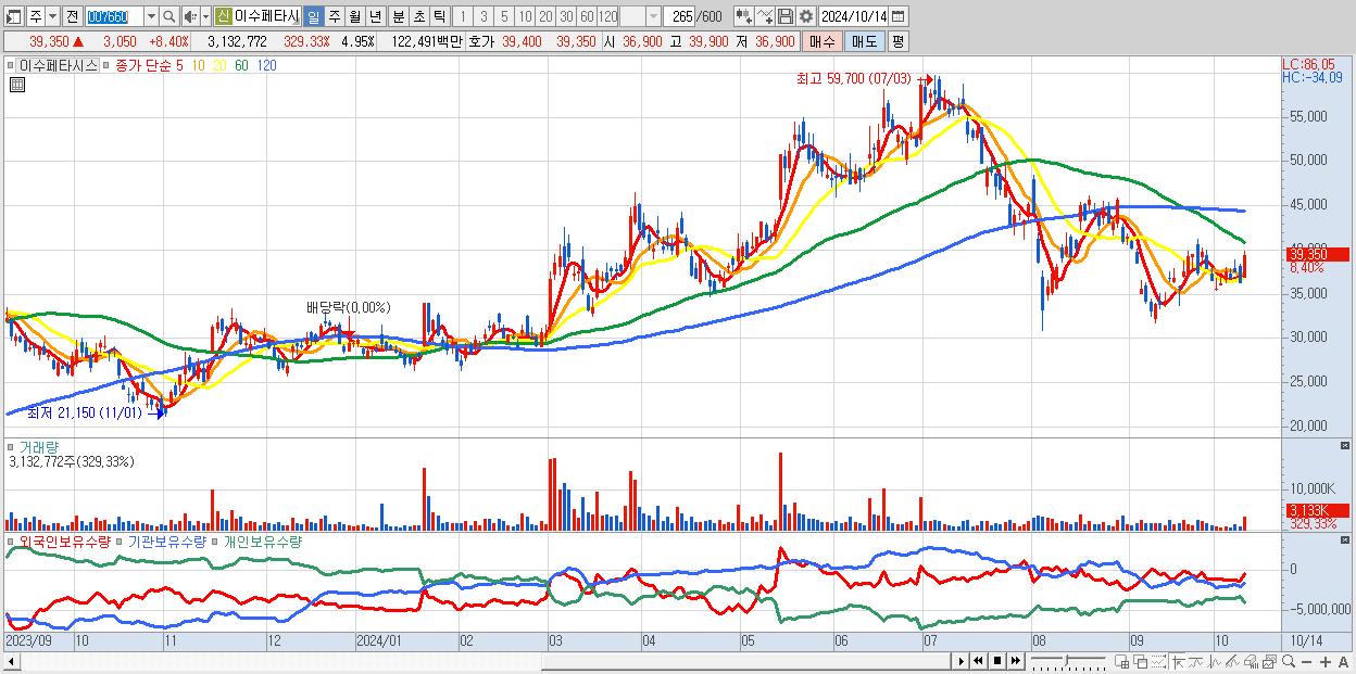 - 이수페타시스 (39,350원 ▲ 8.4% , 시총: 24,887억, 외국인 순매수 거래금:196억)