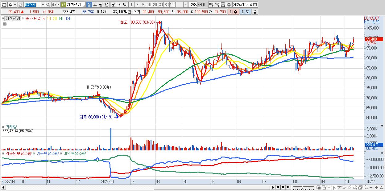 - 삼성생명 (99,400원 ▲ 1.95% , 시총: 198,800억, 외국인 순매수 거래금:55억)