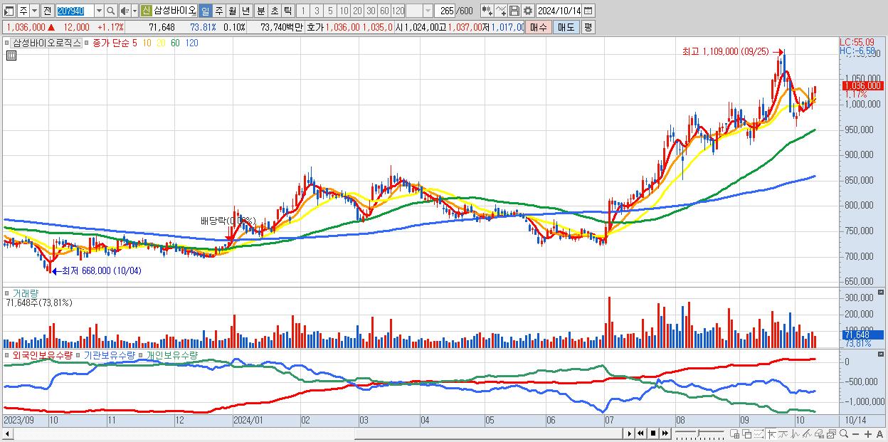 - 삼성바이오로직스 (1,036,000원 ▲ 1.17% , 시총: 737,363억, 외국인 순매수 거래금:48억)